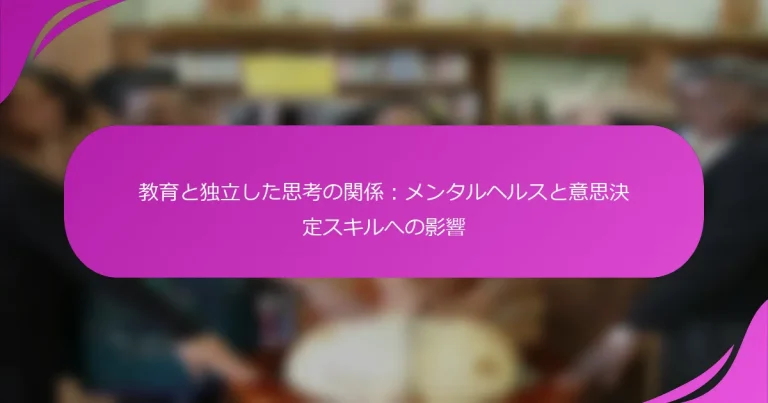 教育は独立した思考を育む上で重要な役割を果たし、これはメンタルヘルスや意思決定能力に大きな影響を与えます。教育は批判的分析、創造性、感情的レジリエンスを高めます。高い教育レベルは不安や抑うつの低い率と関連しており、情報に基づいた選択を促進します。さらに、協力やサポートネットワークを奨励する教育環境は、メンタルウェルビーイングをさらに強化します。 教育はどのように独立した思考に影響を与えるのか? 教育はメンタルヘルスや意思決定能力を高めることによって、独立した思考を大いに育みます。教育は批判的分析、創造性、問題解決能力を促進します。研究によると、高い教育レベルを持つ個人はより良い感情的レジリエンスを示し、メンタルウェルビーイングが向上します。さらに、教育は知識や多様な視点を提供することによって、情報に基づいた意思決定を促進します。この組み合わせは、個人が自分の価値観や目標に合った選択を行う力を与え、最終的には生活の質を向上させます。 独立した思考の主要な要素は何か? 独立した思考は批判的分析、創造性、自己指導を含みます。教育は探求や反省を奨励することによって、これらの要素を育み、エンパワーメントを通じてメンタルヘルスを高めます。この関係は意思決定能力を改善し、個人が選択肢を効果的に評価できるようにします。研究によると、独立した思考に従事する学生はより高いレジリエンスと適応力を示し、これは課題を乗り越えるための重要な特性です。 批判的思考はメンタルヘルスにどのような役割を果たすのか? 批判的思考は独立した思考や情報に基づいた意思決定を育むことによって、メンタルヘルスを大いに向上させます。批判的思考は、個人が状況を分析し、選択肢を評価し、ウェルビーイングにポジティブな影響を与える選択をする能力を備えさせます。研究によると、批判的思考スキルを促進する教育環境は、メンタルヘルスの改善につながります。さらに、強い批判的思考能力を持つ個人は、ストレスや不確実性に対処する能力が高く、不安や抑うつのリスクを減少させます。反省的思考の実践に従事することで、レジリエンスを育むことができ、個人が人生の課題をより効果的に乗り越えることができます。 批判的思考を育むために必要なスキルは何か? 批判的思考には分析スキル、創造性、コミュニケーション、問題解決が必要です。教育はこれらのスキルを育み、メンタルヘルスや意思決定を向上させます。ディスカッションやディベートに参加することで分析スキルが磨かれ、創造的なプロジェクトは革新的な思考を刺激します。効果的なコミュニケーションはアイデアを明確に表現するために重要であり、問題解決の技術は選択肢を評価し、情報に基づいた選択を行うのに役立ちます。これらのスキルは、個人の成長に必要な独立した思考に寄与します。 独立した思考は意思決定能力にどのように影響するのか? 独立した思考は批判的分析と自己信頼を促進することによって、意思決定能力を向上させます。この認知プロセスにより、個人は選択肢をより効果的に評価できるようになります。研究によると、独立した思考に従事する学生はより良い問題解決能力を示します。その結果、彼らはより情報に基づいた意思決定を行います。さらに、独立した思考を育むことはメンタルヘルスの改善につながり、個人がエンパワーメントを感じ、外部の承認に依存しなくなることを助けます。 効果的な意思決定の段階は何か? 効果的な意思決定には、問題の特定、情報の収集、選択肢の評価、意思決定、結果のレビューといういくつかの段階が含まれます。教育は独立した思考を育み、メンタルヘルスや意思決定能力を向上させます。この関係は選択をナビゲートする上での批判的思考の重要性を強調します。研究によると、強い教育的背景を持つ個人はより良い意思決定能力を示し、メンタルウェルビーイングにポジティブな影響を与えます。 教育がメンタルヘルスに与える普遍的な利益は何か? 教育は独立した思考を育み、意思決定能力を向上させることによって、メンタルヘルスを大いに向上させます。教育に従事する個人は批判的思考能力を発展させ、より良い対処戦略とレジリエンスを得ます。研究によると、高い教育レベルは不安や抑うつの低い率と相関しています。さらに、教育は社会的つながりを促進し、これは感情的サポートや全体的なメンタルウェルビーイングにとって重要です。教育の独自の特性は、個人をエンパワーメントし、人生の課題をより効果的にナビゲートできるようにする能力にあります。 知識の増加はどのように不安を減少させるのか? 知識の増加は自信と意思決定能力を高めることによって不安を減少させます。教育は独立した思考を育み、個人が状況を批判的に評価できるようにします。このエンパワーメントはより良い対処メカニズムとストレス管理につなが